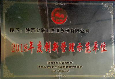 2018年3月,开云英超官网_开云online(中国)漆被陕西省企业信用协会与陕西省企业信用年度创新峰会组委会评为“2018年度创新管理示范单位”